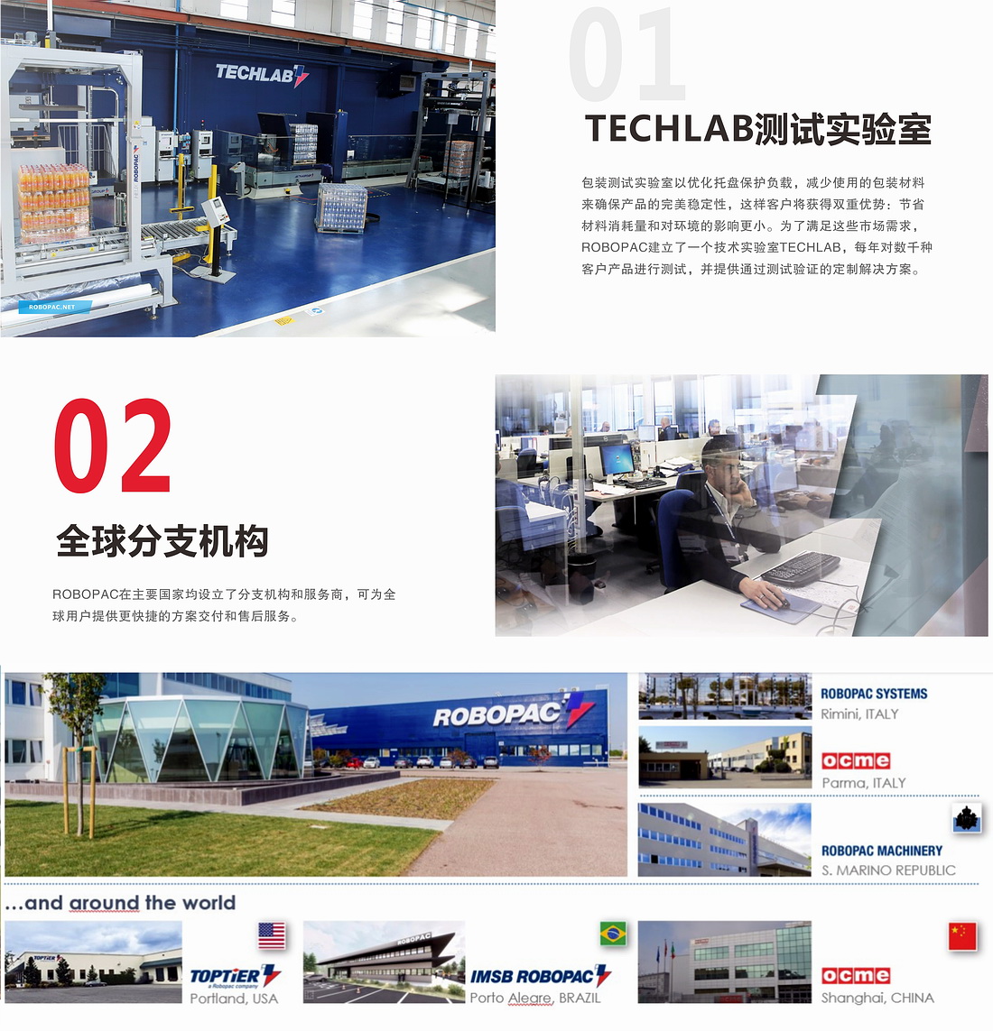 ROBOPAC在全球范圍內生產和銷售各種具有專利CUBE技術的自走式纏繞機(機器人纏繞機),托盤纏繞機,懸臂式纏繞機,在線式纏繞機,全自動高速纏繞機,水平式纏繞機,以及量身定制的整線包裝方案等。集團擁有1500多名員工及9個生產工廠,其中90多名為技術研發人員,在法國,英國,德國,西班牙,美國,俄羅斯,中國設有分支機構,為120多個國家和地區提供產品和服務,出口份額為90%,每年約有6%的營業額用于研發,以確保能夠為客戶帶來真正利益的創新技術解決方案。憑借在全球范圍內出售和安裝的15萬多臺機器,ROBOPAC能夠為包裝行業的各種需求提供廣泛的解決方案和服務。